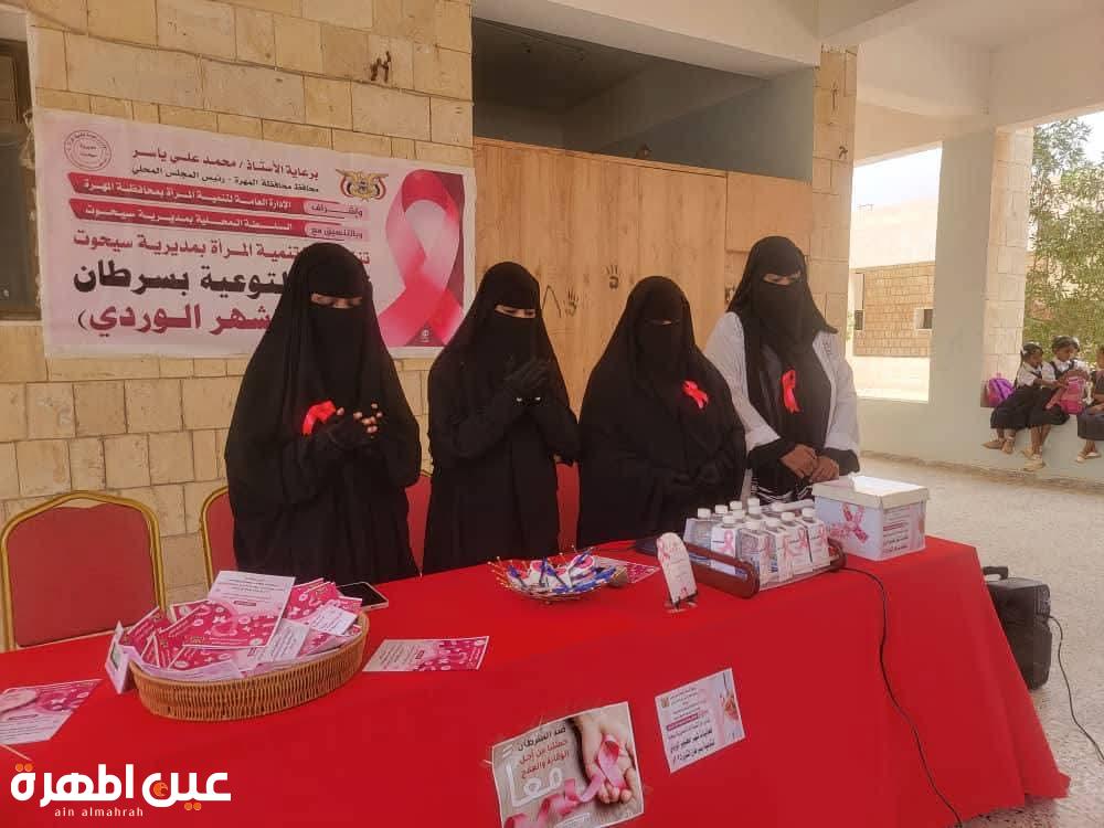 دشنت مديرة إدارة تنمية المرأة بمديرية سيحوت الأستاذة أوسان عقيل باعبّاد، يوم أمس الأربعاء، في مدرسة أروى للتعليم الأساسي والثانوي، فعاليات شهر "أكتوبر الوردي 2025م" للتوعية بمرض سرطان الثدي، تحت شعار "نعم للوعي، نعم للدعم، نعم لحياة خالية من السرطان"، وذلك برعاية الأستاذ محمد علي ياسر محافظ محافظة المهرة، وإشراف الإدارة العامة لتنمية المرأة بالمحافظة، والسلطة المحلية بمديرية سيحوت.