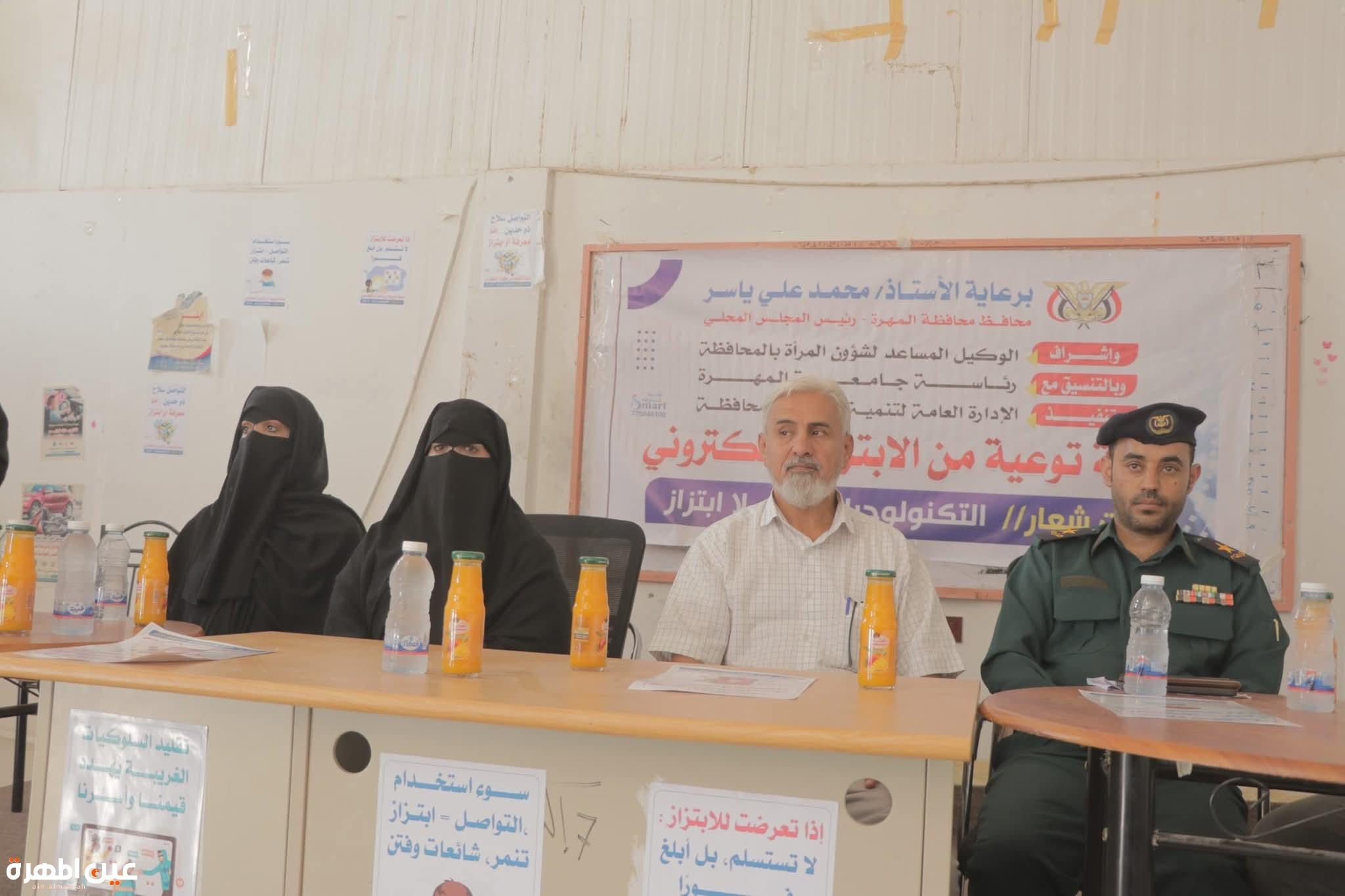 تواصلت فعاليات حملة التوعية بمخاطر الابتزاز الإلكتروني، التي تُقام تحت شعار "التكنولوجيا وعي.. لا ابتزاز"، وذلك برعاية الأستاذ محمد علي ياسر محافظ محافظة المهرة، وبتنظيم من الإدارة العامة لتنمية المرأة بالمحافظة وبالتنسيق مع رئاسة جامعة المهرة وإشراف الوكيل المساعد لشؤون المرأة بالمحافظة.