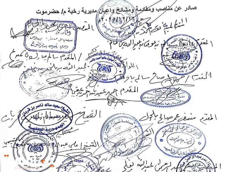 أصدرت المناصب والمقادمة والمشايخ والأعيان في مديرية رخية بمحافظة حضرموت بياناً أعلنوا فيه تأييدهم ومساندتهم الكاملة للنخبة الحضرمية والقوات المسلحة الجنوبية، وذلك في إطار عملية "المستقبل الواعد" التي نفذت في مديريات الوادي والصحراء.
